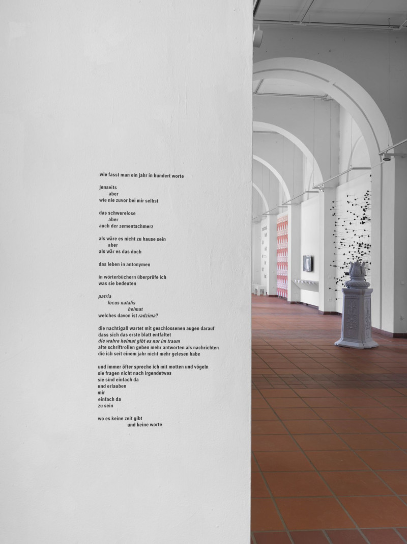 Der Titel der Ausstellung stammt aus einem Gedicht der belarusischen Dichterin Volha Hapeyeva, die derzeit ebenfalls im deutschen Exil lebt. In ihrem Essay Die Verteidigung der Poesie in Zeiten dauernden Exils beschwört sie Poesie und Kunst als Mittel des freien Denkens und des Widerstands gegen die bürokratische Sprache von Staaten und gegen diktatorische Gewalt.