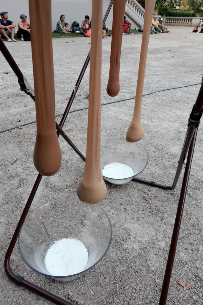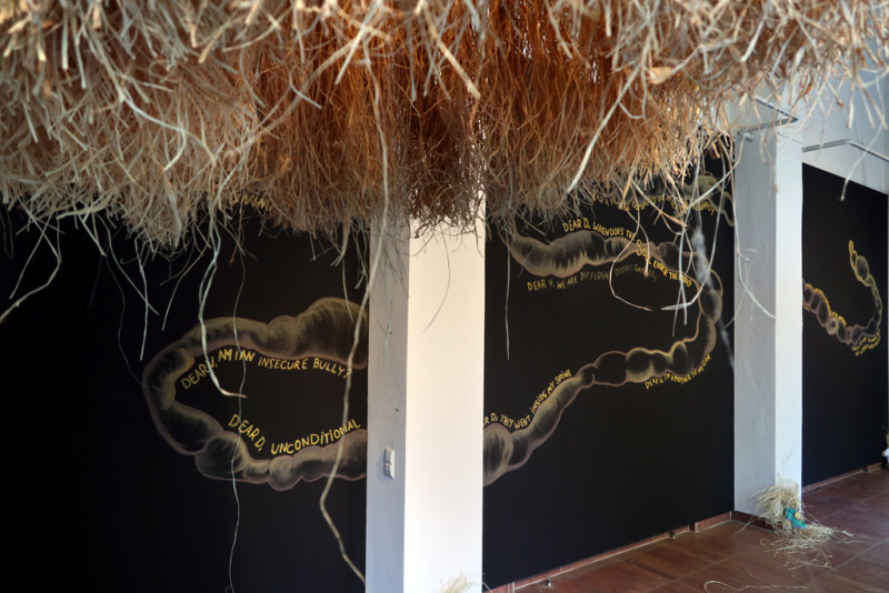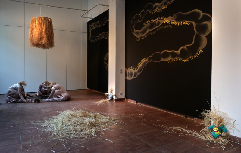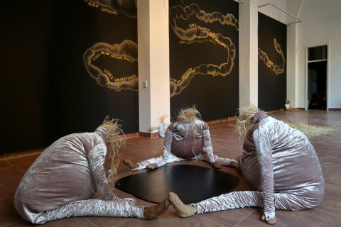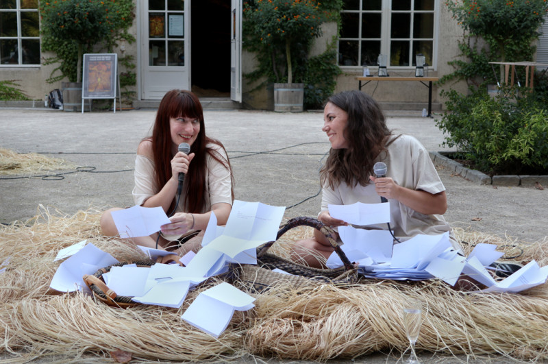 Für ihr Projekt „There May Be Milk There May Be Hay“ (Es könnte Milch geben, es könnte Heu geben) bauen Viviana Druga und Dafna Maimon den Kreativraum im Körnerpark zu einer Art Support-Zentrum um und lassen ein Labor entstehen, in dem sie gemeinsam somatische Erfahrungsstrategien erproben. Als Vorbereitung haben sich die Künstlerinnen während des Frühlings Briefe geschrieben, in denen sie über emotionale und körperliche Intelligenz meditieren. Dabei begreifen sie ihre Gebärmütter als eigentliches Gehirn dieser Korrespondenz. Gegenstand ihres Austauschs sind Fragen rund um Reproduktion, Liebe, Fruchtbarkeit und Opfer, wobei beide Künstlerinnen aus ihren persönlichen Erfahrungen und Biographien schöpfen. „Es könnte Milch geben, es könnte Heu geben, es könnte Reue geben, es könnte Angst geben.“