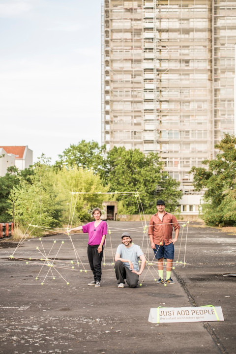 Bei diesem skulpturalen Architekturspiel baut eine Gruppe, die sich noch nicht kennt, zusammen an einem Gebilde aus Verbindungen, Knoten, Stäben. Es entsteht ein temporärer Traumpalast, ein Ort, den es vielleicht einmal gab oder den es in Zukunft geben könnte. Jede/r kann teilnehmen!