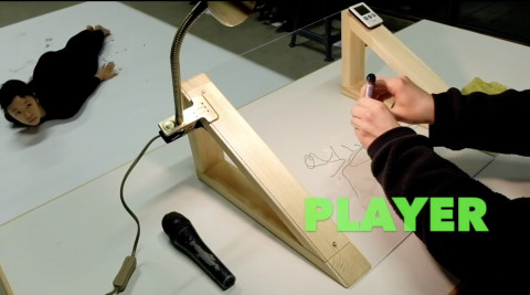 While we are engaged in the tasks of the game, the pen spontaneously captures on a 2x2 m paper, the result, as the final act of the performance.