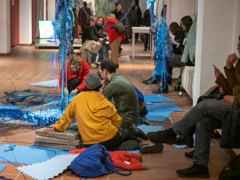 un_ravel draws a picture of a utopian landscape immersed in blue, made of layers and interweavings, inhabited by sympoietic* entities in constant motion, creating new fabrics and dissolving the rigid. Everyone is invited to take up the threads, to continue them, to drop them and to rework them. Thus, whatever is there is simultaneously determined and discarded, dissolved and expanded – is both beginning and end.