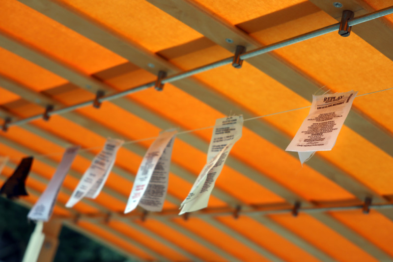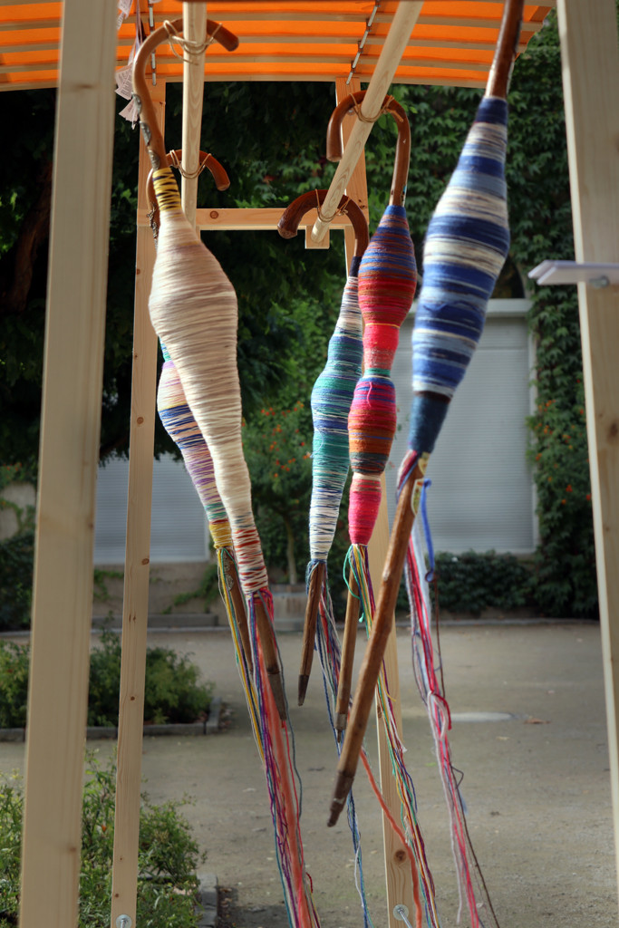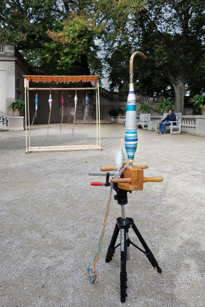The artist processes goods from East Asia into an art object. For this, the wool of worn and discarded sweaters is separated and rolled onto a bobbin. By walking in a circle, the wool is coiled from the carrier spool onto a sculpture (walking stick) placed in the center. In a continuous process of walking in a circle and unwinding the wool, a walking stick is transformed into an art object.